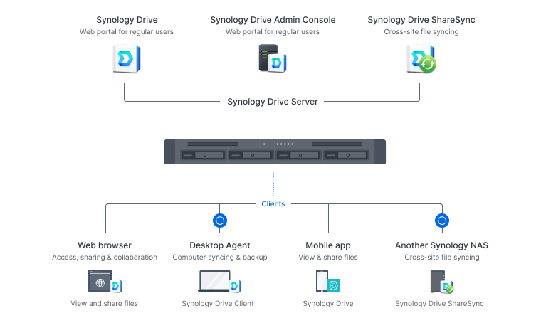 Synology Drive 作为一种私有云解决方案,可通过直观的桌面和移动应用程序实现远程数据存取、数据同步,以及随时还原和备份所需文件。