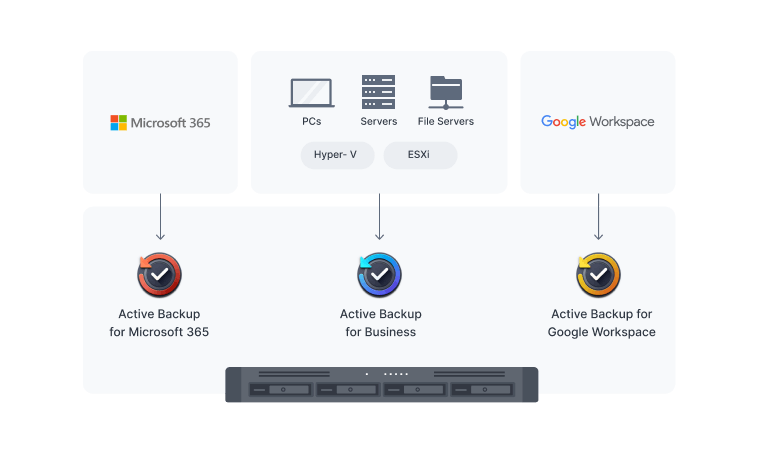 使用 Active Backup for Business 可安全地备份 Windows 和 Linux 端点、Synology 服务器以及 VMware® 和 Hyper-V® 虚拟机。